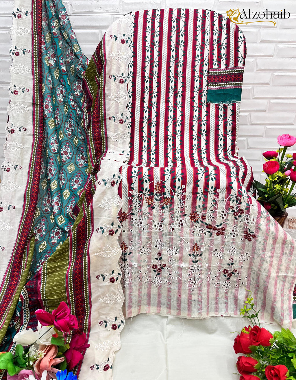 Al Zohaib 1087 Pure Cotton Print With Embroidery Self Work Pakistani Suits