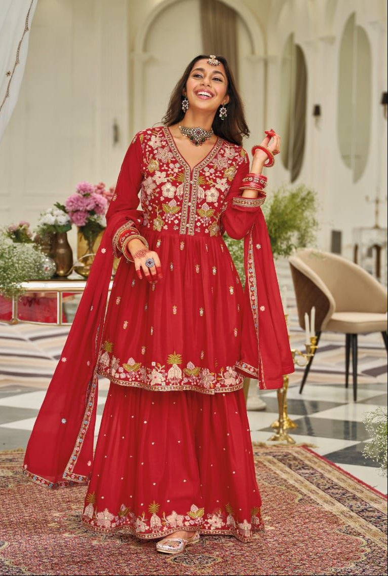 The top is made from heavy chinon fabric adorned with embroidery work, offering a luxurious fall and refined boutique-style finish. It is paired with a beautifully coordinated heavy chinon palazzo with embroidery, creating a stylish and comfortable silhouette.