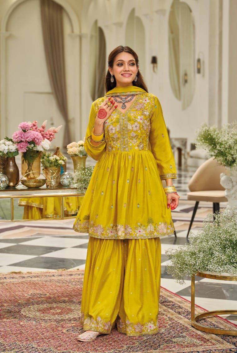 The top is made from heavy chinon fabric adorned with embroidery work, offering a luxurious fall and refined boutique-style finish. It is paired with a beautifully coordinated heavy chinon palazzo with embroidery, creating a stylish and comfortable silhouette.