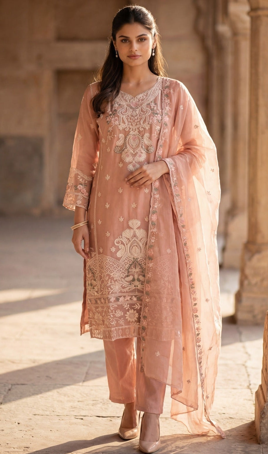 Enhance your ethnic collection with this elegant suit set from FEPIC – Rosemeen Catalogue, Design No. 6457 A Crafted in soft and lightweight chiffon fabric, this outfit offers a graceful drape and a refined look, making it ideal for festive occasions, parties, and evening wear.