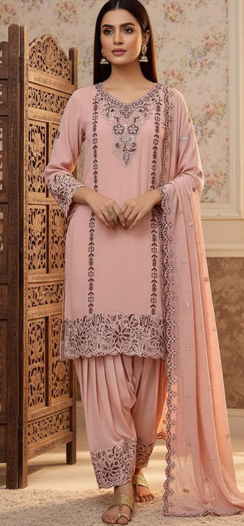 This full stitched 3-piece suit set is crafted from premium heavy georgette fabric, offering a rich and graceful fall. The top features a flowy and festive silhouette, perfect for special occasions.
