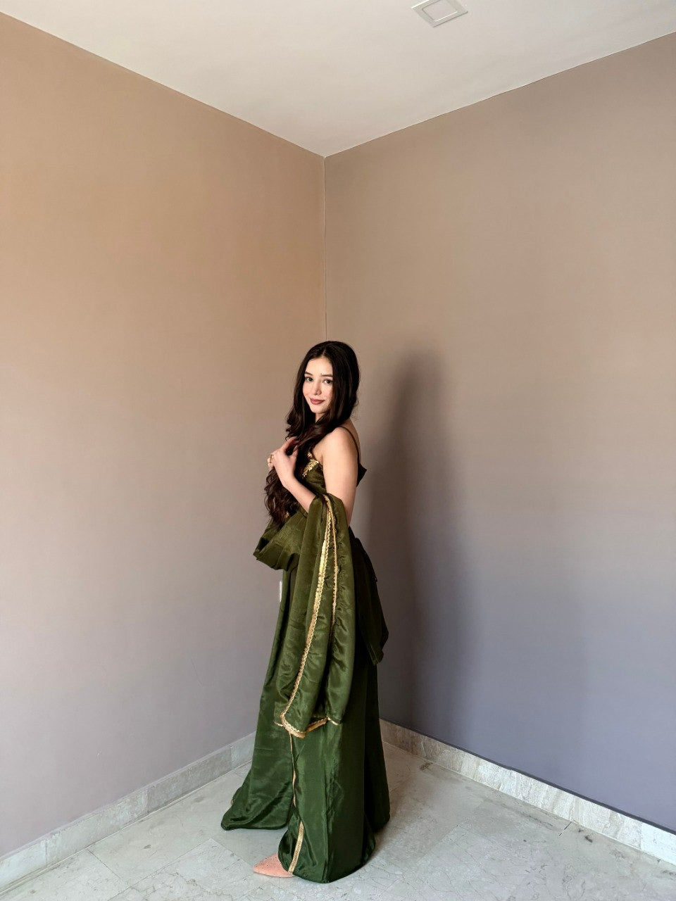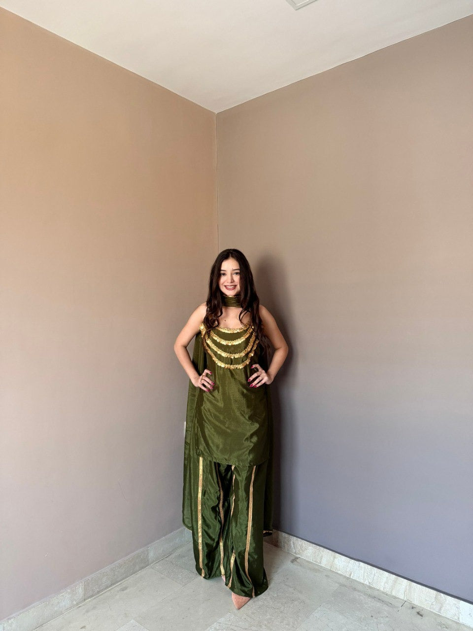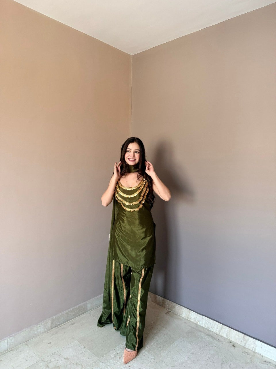 Step into timeless elegance with this designer chinon kurti set, crafted to bring out effortless grace and modern ethnic charm. Made from premium-quality chinon fabric, this ensemble features a beautifully tailored kurti, a coordinated bottom, and a soft, flowy dupatta enhanced with intricate ethnic border work.