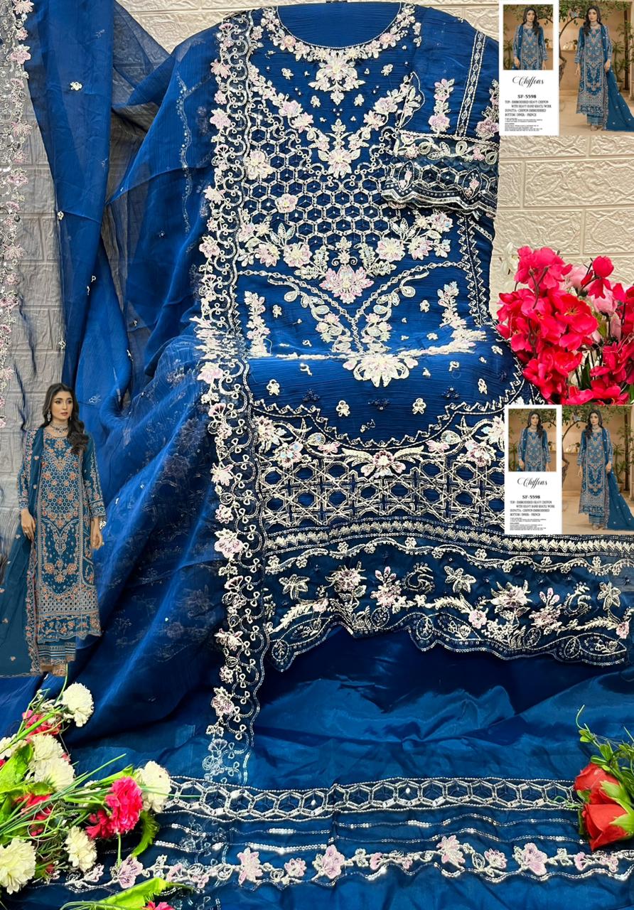 Step into timeless elegance with our SF-5598 A Heavy Embroidered Chiffon Suit by Shree Fabs, Surat. Designed for festive occasions, weddings, and formal gatherings, this luxurious 3-piece set blends rich craftsmanship with premium fabrics.