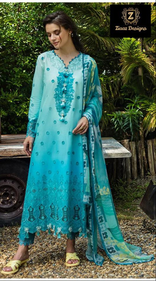 The kameez is made from premium cambric cotton with heavy embroidery and shaded detailing, giving it a graceful and boutique-style finish. As a semi-stitched piece, it allows you to tailor the fit according to your style preference.