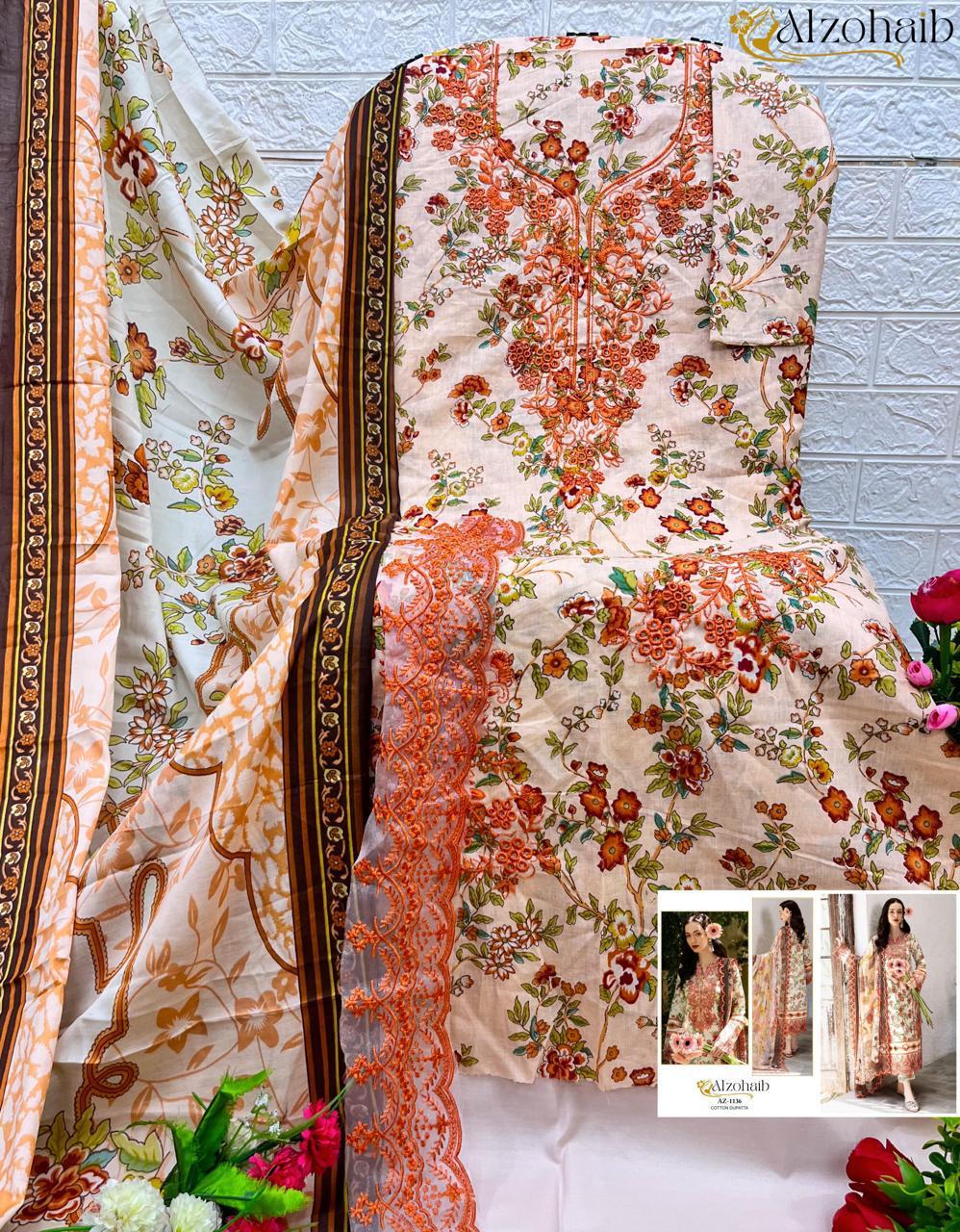 Al Zohaib Az 1136 Pure Cotton Print With Self Boring Work Pakistani Suits